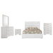 Transform your bedroom into a modern oasis with this sleek bedroom set, blending contemporary design with practical functionality. Anchored by a stunning upholstered bed wrapped in white faux leather, the set exudes a minimalist aesthetic complemented by clean lines and high-gloss finishes. Spacious case pieces, including a nightstand, dresser, dresser mirror, and optional chest, feature polished chrome accents and smooth drawer glides for effortless operation. Perfect for bedrooms of any size, this set offers both style and storage for a refined and organized space.