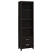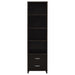 Elevate your living room with this four-piece entertainment center, finished in rich cappuccino for a sleek contemporary look. The 60-inch TV console accommodates televisions up to 60 inches and includes two framed clear tempered glass doors, adjustable shelving, and three drawers for organized storage. Flanking media towers provide additional open shelving for books and decor, along with two drawers each for concealed items. A connecting bridge tops the unit, featuring two enclosed compartments to complete the design. Brushed silver hardware and tapered legs add refined finishing touches._x005F_x000D_ Key Features: • Cappuccino 4-piece entertainment center with clean lines and brushed silver hardware • 60-inch TV stand supports televisions up to 60 inches with modern storage features • Two framed clear tempered glass doors with four adjustable shelves for media gear • Three central drawers in console provide concealed storage for games and devices • Twin media towers each feature four open shelves and two drawers for organization • Bridge includes two enclosed compartments, completing this cohesive entertainment wall